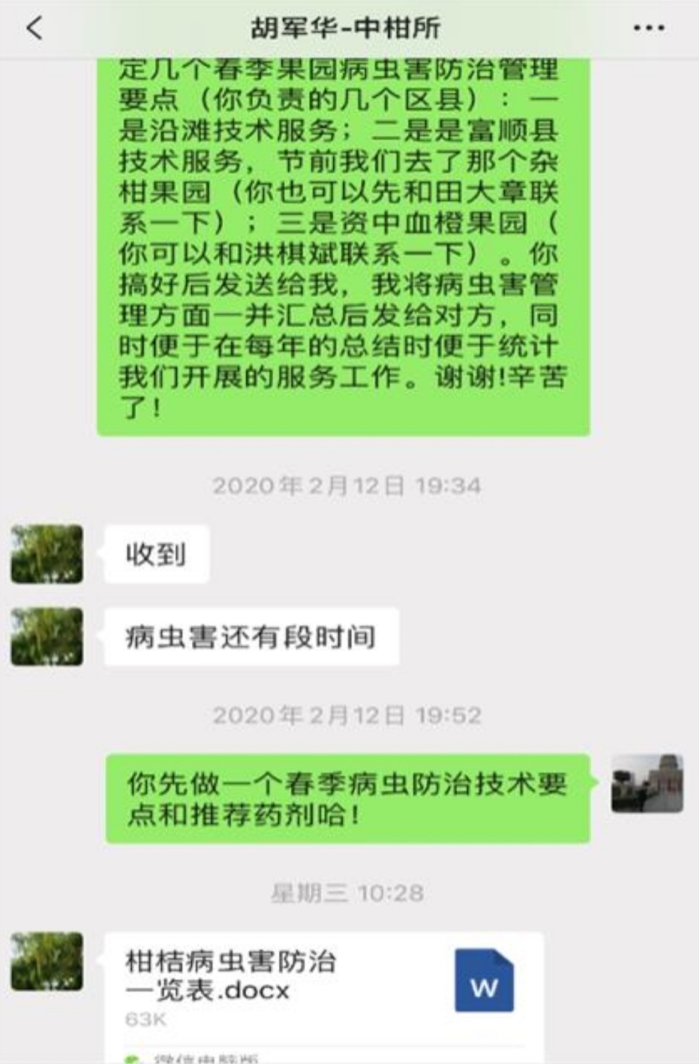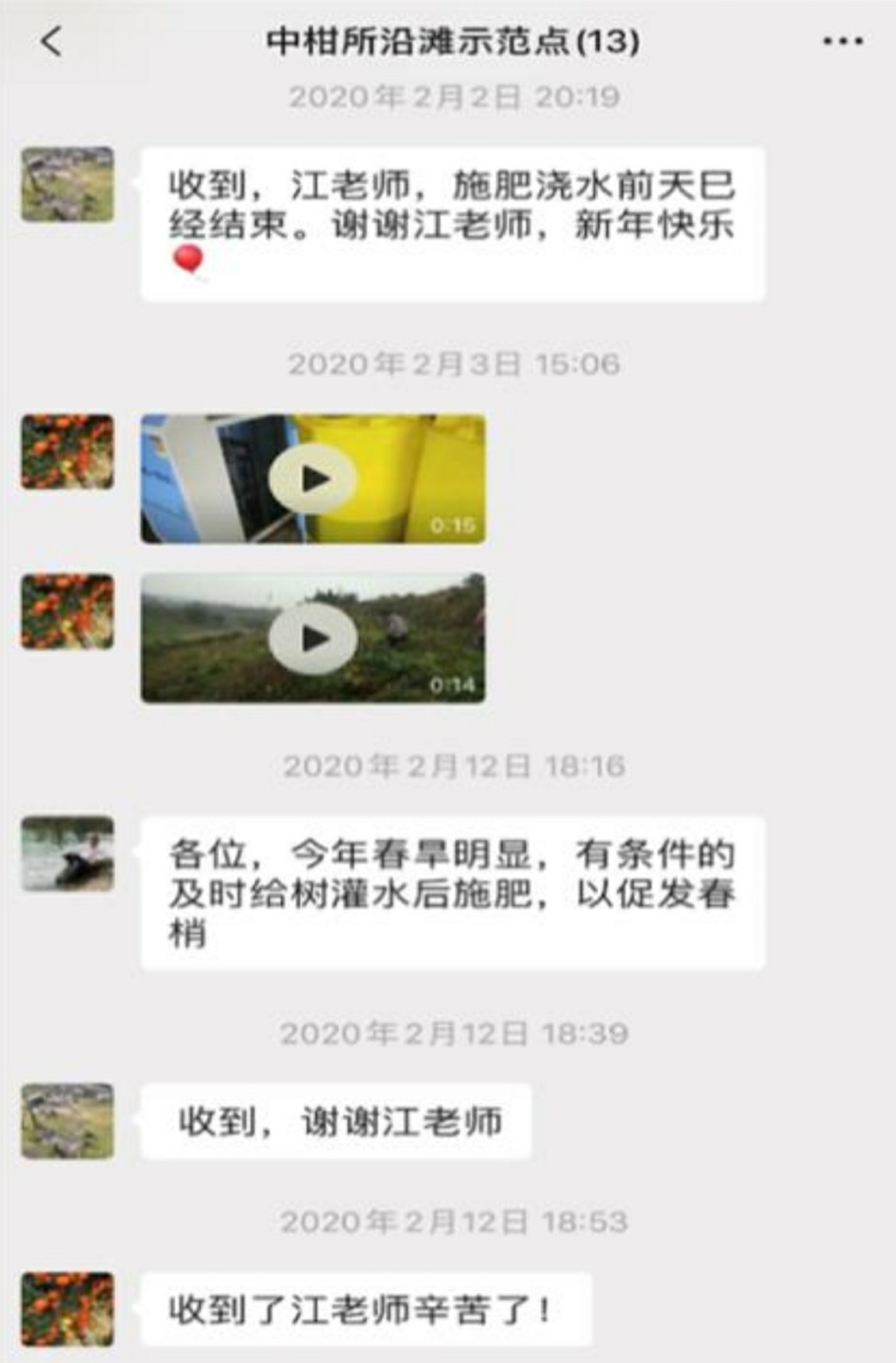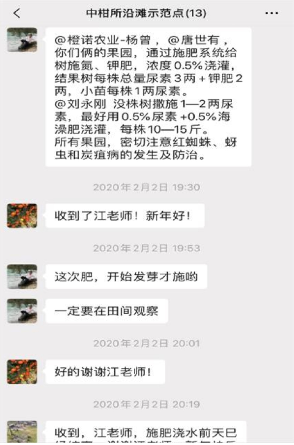2月初,在四川自贡沿滩区,西南大学柑桔研究所专家江才伦及其技术服务团队通过微信群对果农们进行及时指导。专家们根据当地物候期和果园类别,提供专门的春季管理技术,制定了科学合理的技术管理措施,通过微信群及时指导,加强对果农们的监督,以达到科学问诊。当前,该区3个示范果园已全部按照专家提出的技术措施落实到位。