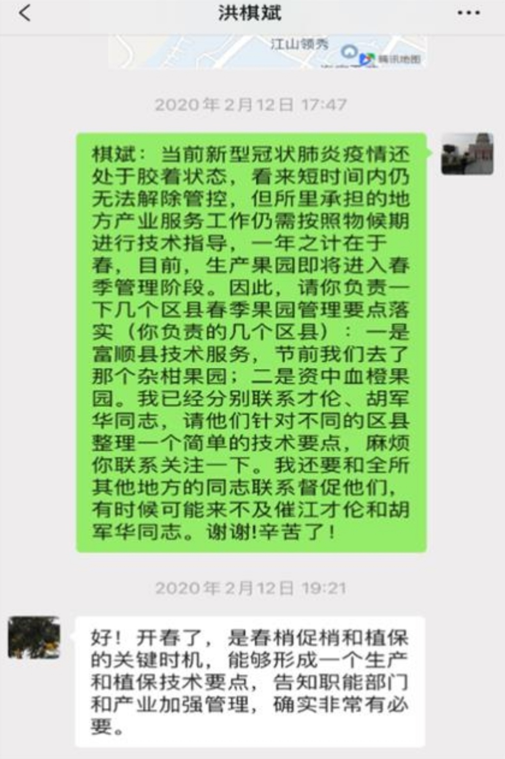 2月份以来,该所栽培与生理研究专家团队为异常柑桔果园提供远程技术诊断和矫治方案,彭良志研究员通过线上平台先后为广西柳州市柑桔品种更新提供了柑桔新品种信息和技术咨询建议,为重庆市奉节县和四川雷波县编制了《有机脐橙栽培技术规程》,以及相应的果园管理技术要求,并及时为奉节县提供脐橙市场动态信息,为疫情期间减少脐橙销售损失起了较好作用。彭良志研究员表示:“2、3月是果园管理种植的关键时期,我们研究所更要加紧工作,为示范基地、果农提供技术支持,千万不能因为疫情误了农时,这是最关键的。”