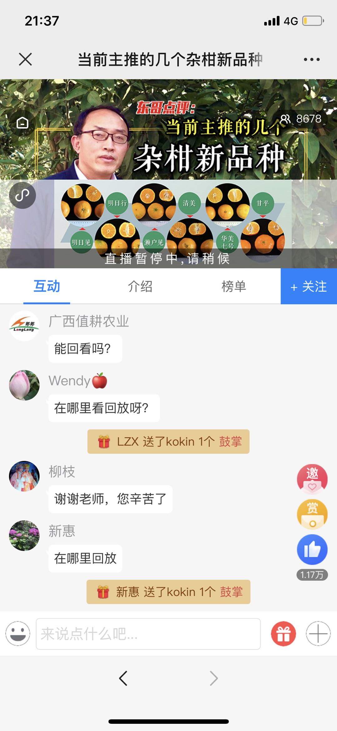 这样新颖的方式第一次就取得了良好的效果。在江东的第一课“当前主推的杂柑新品种”中,介绍了新品种的选育引种过程、果实品质表现、树体生长结果特征、栽培技术要点等,来自全国各地的果农、技术专家和大学生进入直播间超过8600人次,课间提问咨询互动达到1.2万人次,不少人互动留言要求开设课后点播,以便今后生产实践中反复学习实践。