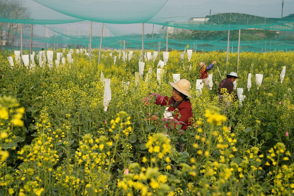 ↑2月22日,在重庆市油菜工程技术研究中心,西南大学农学与生物科技学院的学生在给油菜花套袋。
