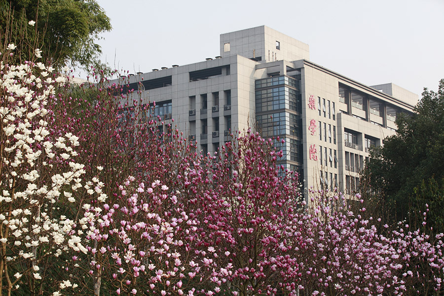 鲜花掩映的教学楼。 杨坚摄