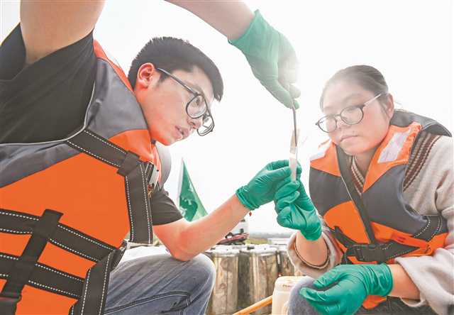 科研人员对人工鱼巢附近水域进行水体环境DNA采样。