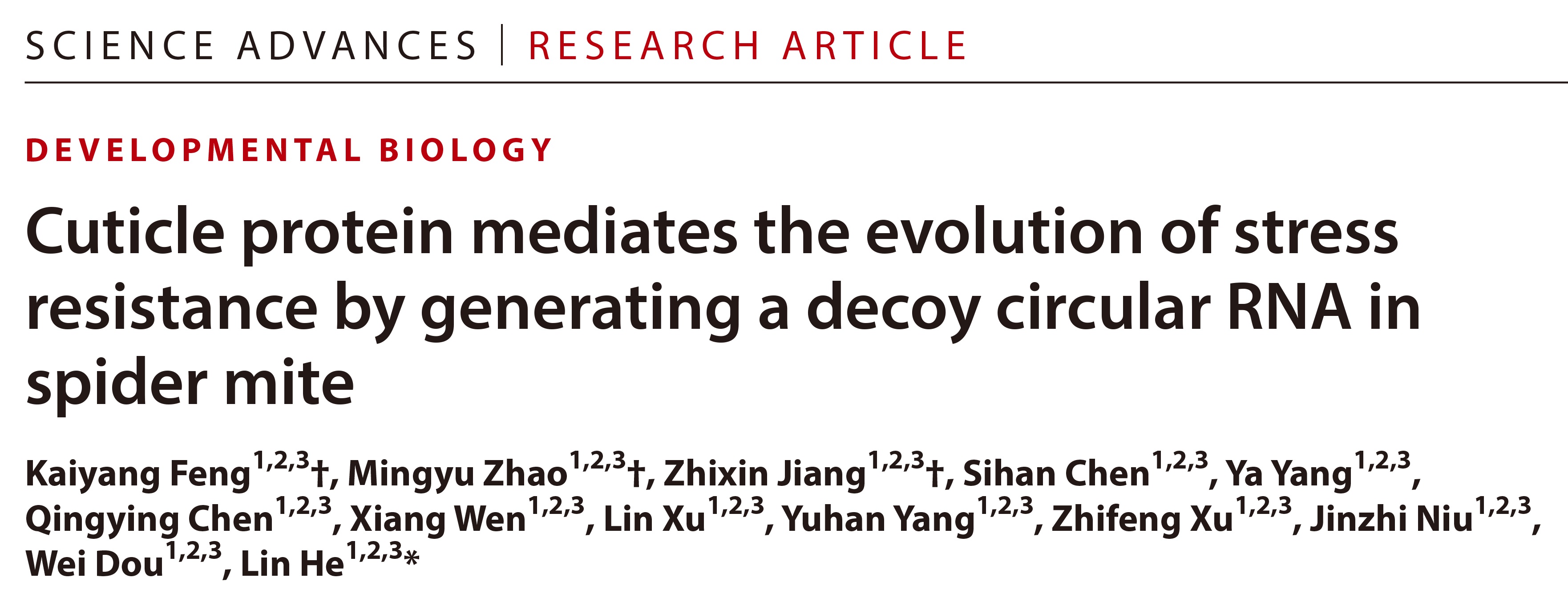 近日,西南大学何林教授团队在Science子刊Science Advances上在线发表了题为“Cuticle protein mediates the evolution of stress resistance by generating a decoy circular RNA in spider mite”(译:朱砂叶螨表皮增厚介导抗逆性进化的诱饵RNA机制)的研究论文,首次发现并系统阐明了朱砂叶螨表皮发育增厚会导致其对多种杀螨剂产生广谱的交互抗性,表皮蛋白可通过释放“诱饵”RNA拮抗并抑制miRNA簇的功能,从而调控自身过表达,最终导致朱砂叶螨表皮发育增厚,促进其抗逆性进化的分子新机制。