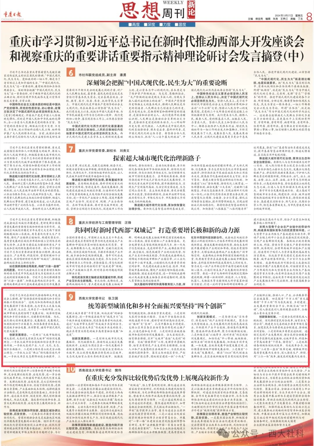 习近平总书记着眼以中国式现代化全面推进强国建设、民族复兴伟业,在新时代推动西部大开发大局中赋予了重庆新的时代使命和战略定位,为重庆发展带来了前所未有的重大历史性机遇。为推动习近平总书记殷殷嘱托落实落地、见行见效,5月13日,重庆市召开学习贯彻习近平总书记在新时代推动西部大开发座谈会和视察重庆的重要讲话重要指示精神理论研讨会。我校党委书记张卫国出席研讨会并作了题为《统筹新型城镇化和乡村全面振兴要坚持“四个创新”》的研讨发言,这是我校人文社科专家积极主动对接国家、区域重大战略和地方发展实际需要,努力为助推区域经济高质量发展和乡村全面振兴贡献智慧和力量的重要表现,为新时代推动西部大开发贡献了西大智慧。5月17日,《重庆日报》进行了摘登。