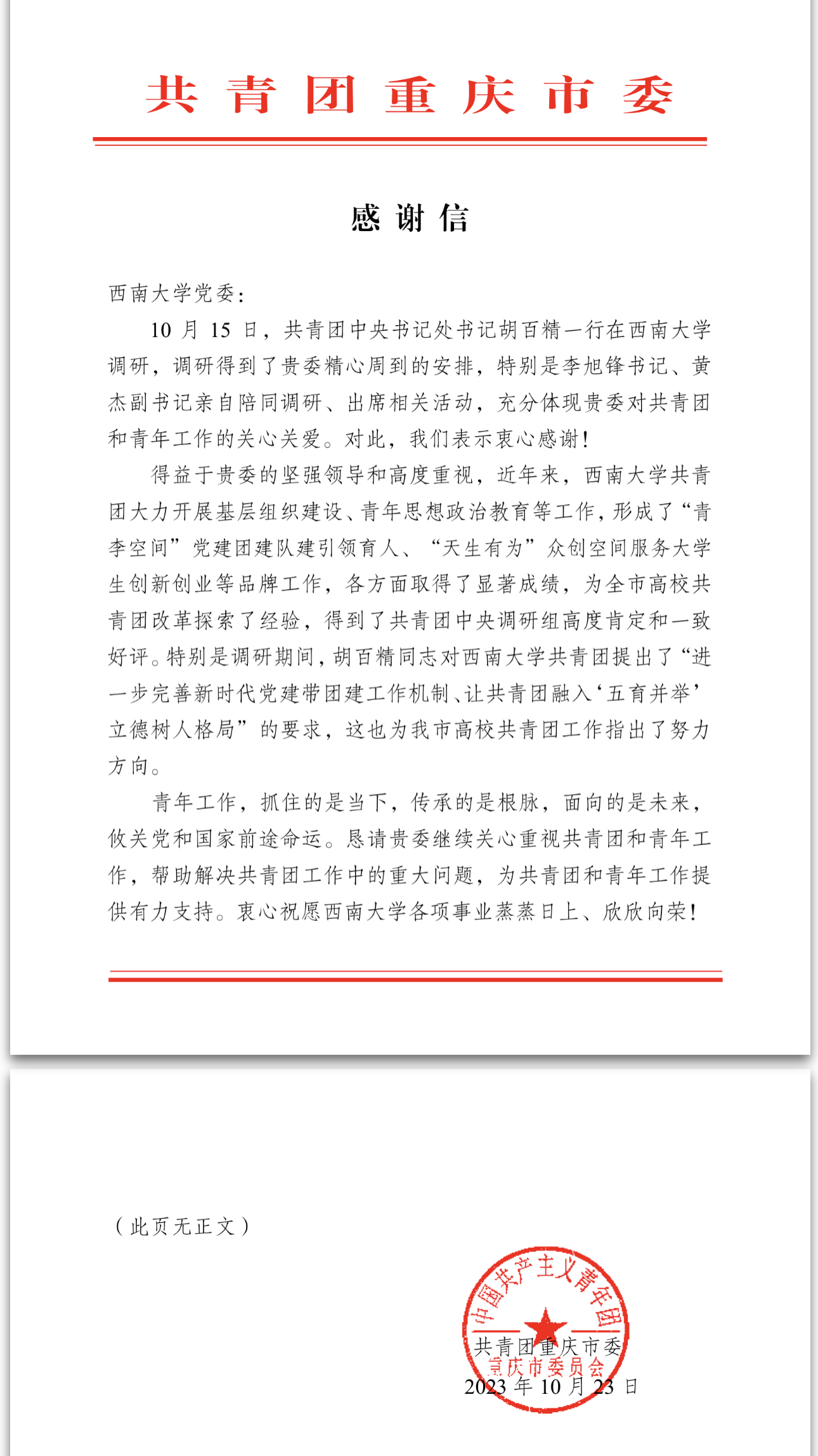 近日,共青团重庆市委向学校党委发来感谢信,对学校共青团的基层组织建设、青年思想政治教育等工作给予充分肯定,对学校精心筹备、周密安排共青团中央书记处书记胡百精一行的调研活动表示衷心感谢。