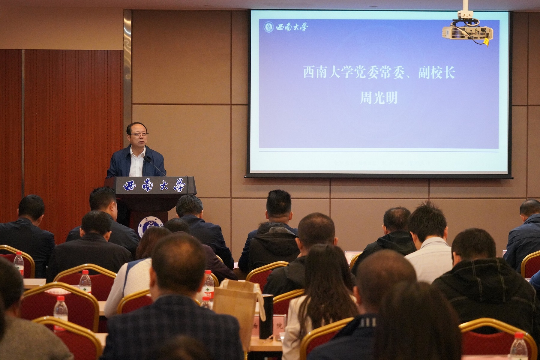 10月31日,学校高价值创新创业成果培育与转化专题培训会(第一期)在桂园宾馆顺利举行。副校长周光明、重庆市科技局成果转化与创新创业处四级调研员王蔡君、市高校成果转化服务中心主任徐珮杰、北碚区科技局副局长向鲲等出席开班仪式,21个学院(所、室)分管科研领导、科研秘书,各学院重点创新团队教师代表及相关职能部门负责人110余人参加培训会,创新创业学院院长张斌主持开班仪式。