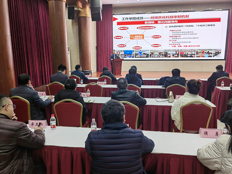 为全面贯彻党的二十大精神,回顾总结过去一年学校科技工作情况,部署寒假重点科技工作。1月9日上午,学校召开2023年科技工作总结暨寒假重点科技工作安排部署会,副校长王进军出席会议,相关二级教学科研单位有关负责人、科学技术处科级以上干部参加会议,会议由科学技术处副处长段有德主持。