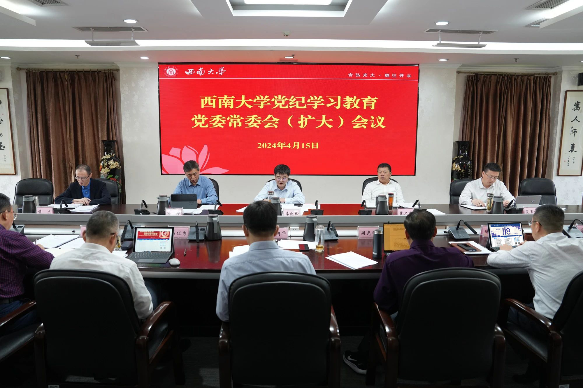 4月15日,学校召开党委常委会(扩大)会议,学习习近平总书记关于开展党纪学习教育的重要讲话和重要指示精神,以及中共中央办公厅、教育部党组关于开展党纪学习教育的有关要求,研究《中共西南大学委员会党纪学习教育工作方案》,正式启动学校党纪学习教育。