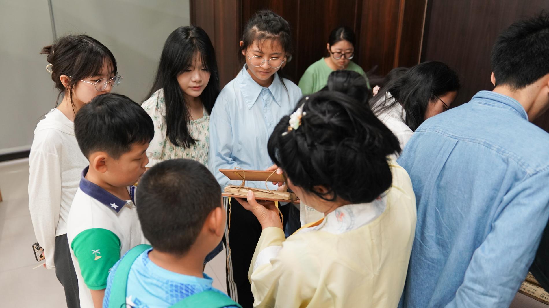 活动期间,图书馆特藏部教师身着汉服,带领师生参观古籍书库,为师生讲解展出古籍。这些古籍有的已有数百年历史,纸张泛黄,墨迹斑驳,但插图依旧清晰可见,足见其制作工艺之精湛。值得一提的是,清乾隆间翻刻的明万历本《帝鉴图说》是身为首辅的张居正为幼帝万历精心编撰、量身打造的图文并茂的专用教材,书名取唐太宗“以古为鉴,可知兴替”之意,全书插图众多,十分精美,故事深刻,引人深思。