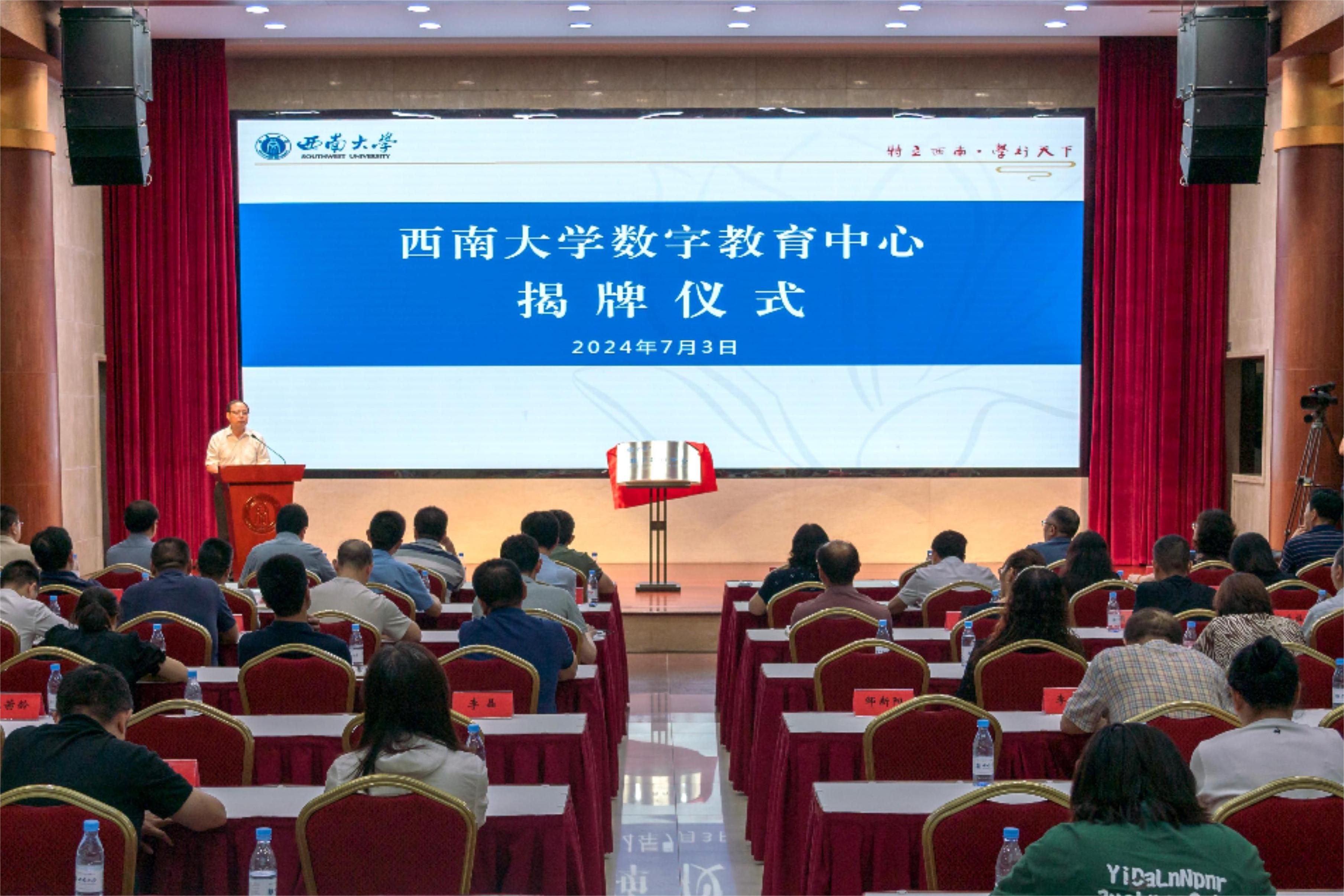 为深入落实教育数字化战略行动,加速推进学校数字教育建设,7月3日下午,西南大学数字教育中心揭牌仪式在学校东方红会议厅举行。副校长周光明出席,数字教育中心工作组成员单位主要负责人、各教学单位本科教学分管领导、专家代表、数字化课程教师代表及虚拟仿真实验教学项目负责人代表参加。仪式由继续教育学院党委书记张斌主持。