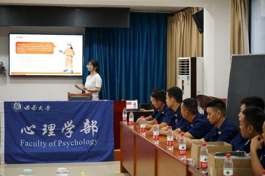 7月5日,心理学部“三下乡”社会实践团与重庆市北碚区城东消防救援站协同开展“释放压力,轻装上阵”主题活动,通过主题宣讲帮助消防员们辩证认识压力的利弊和学习压力转化的相关方法,并组织了“踩地雷”游戏和木工雕刻等体验活动。