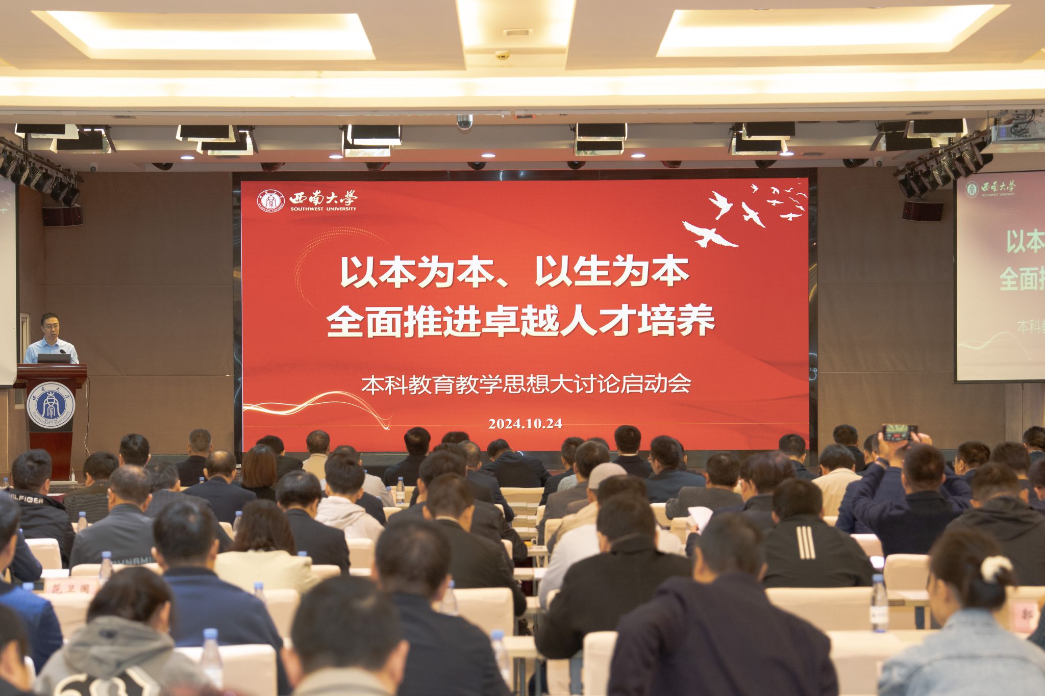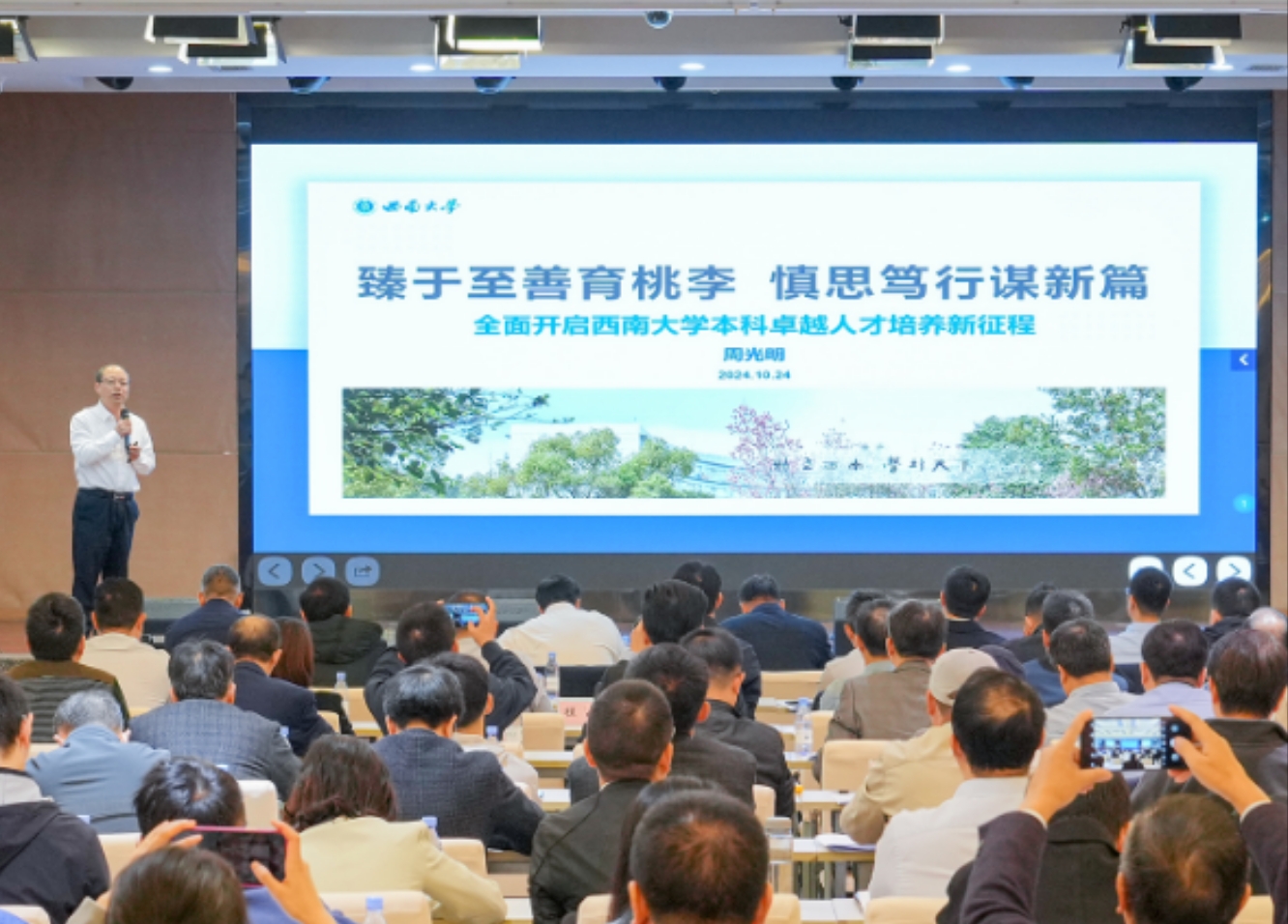 周光明以“臻于至善育桃李,慎思笃行谋新篇”为题作西南大学本科人才培养现状分析报告,剖析了学校本科教育当下面临机遇与挑战,强调要瞄准问题、碰撞思想、形成共识、明确举措,全面开启本科卓越人才培养新征程。