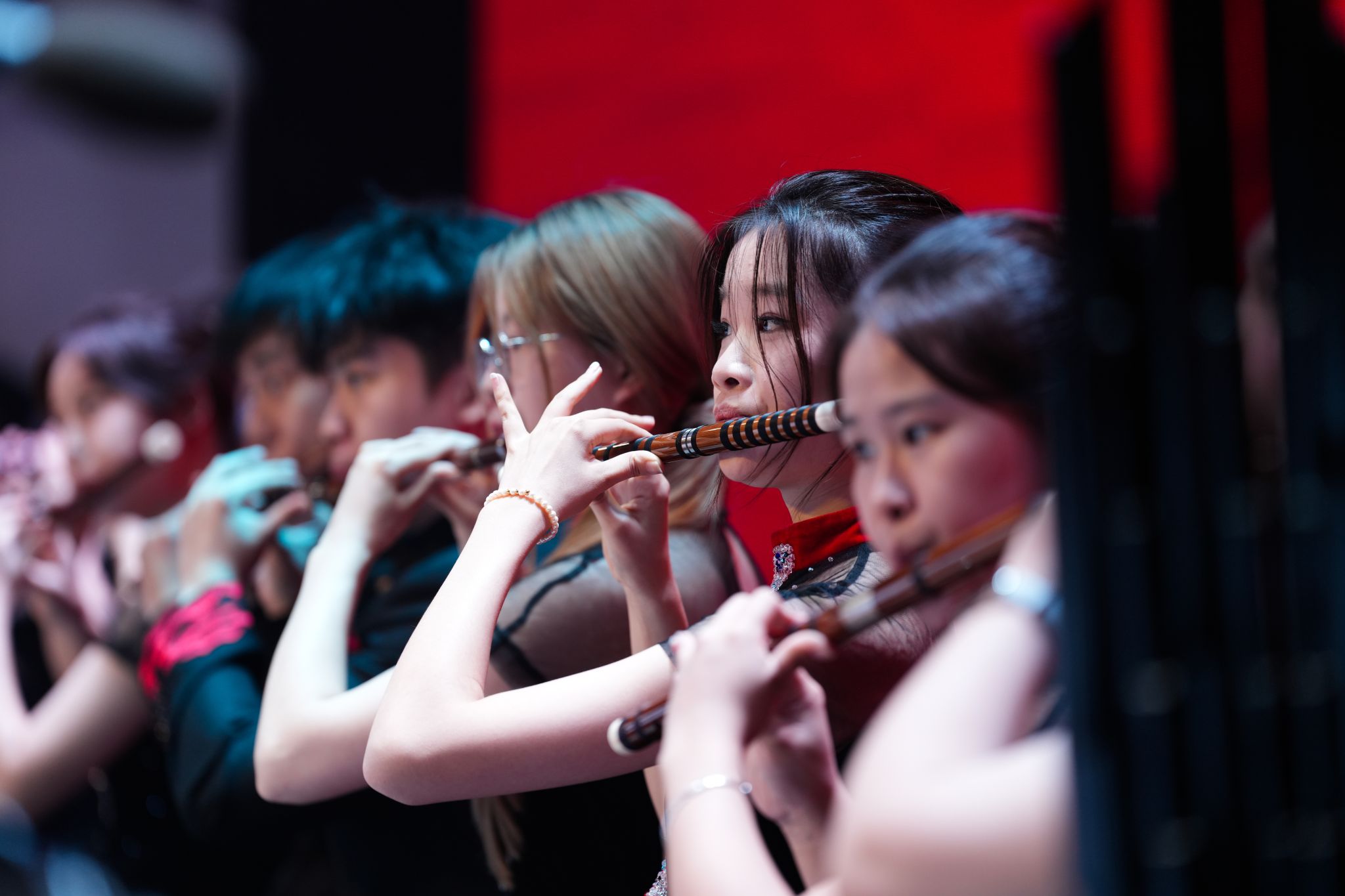 音乐会根植中华优秀传统文化,分为“映初心”“铸辉煌”“向未来”三个篇章。一首激昂的民族管弦乐《庆典序曲》拉开晚会序幕,欢快旋律似金风乍起,喜庆的氛围如繁花盛放,瞬间感染在场观众。