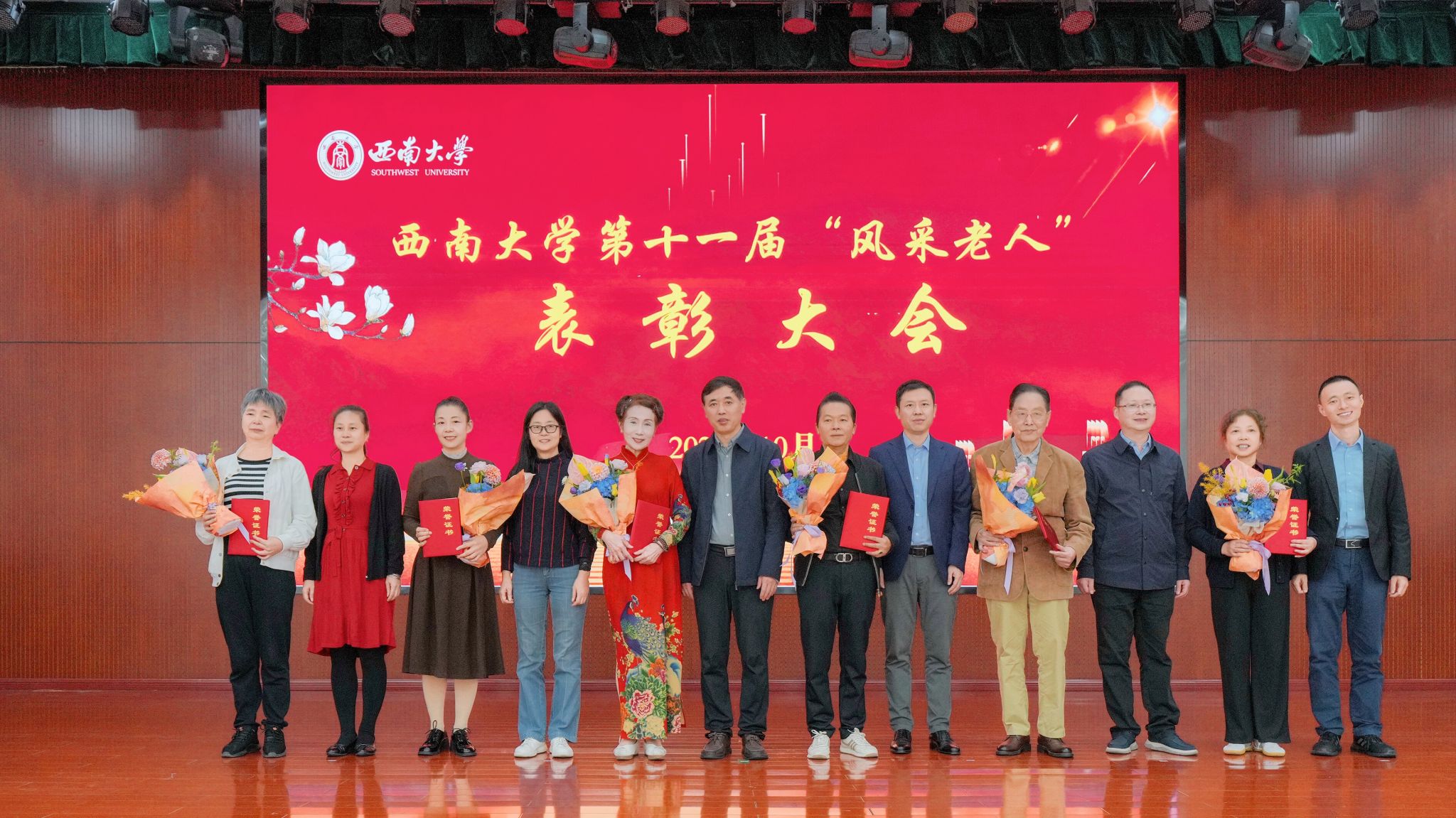 会上,离退休党委书记李红宣读《西南大学关于表彰第十一届 “风采老人” 的决定》,与会领导为受表彰的老同志颁发荣誉证书。“风采老人”代表、文学院退休教师李达武发表感言,用《越人歌》《步出夏门行·龟虽寿》等经典诗词表达对祖国的深情热爱和诚挚祝福,号召广大离退休教职工围绕教育强国建设,聚情、聚智、聚力,为推动学校高质量发展续添正能量,再作新贡献。