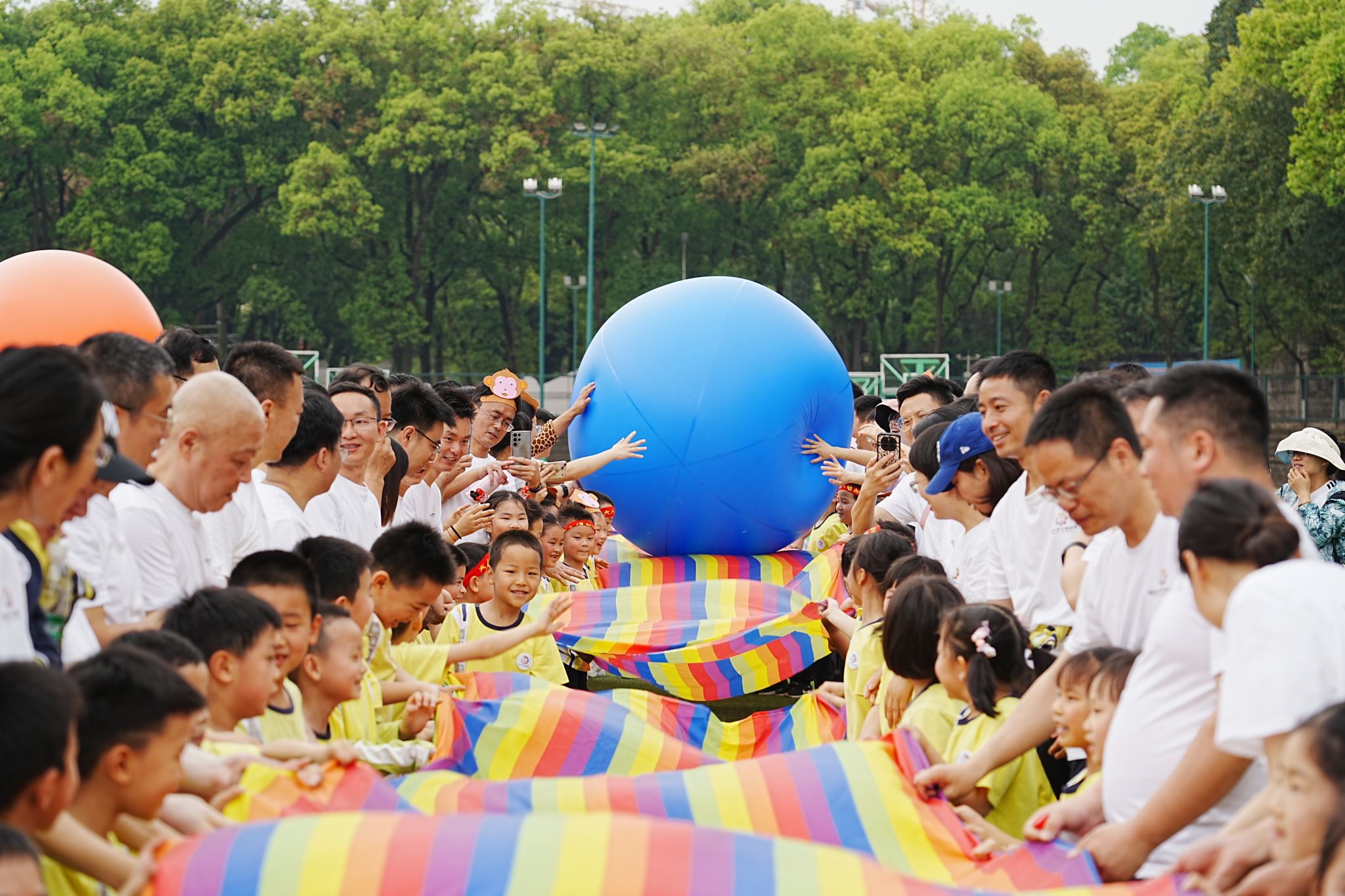 2024年3月,小朋友和家长一同在亲子运动会上参与大型体能游戏。