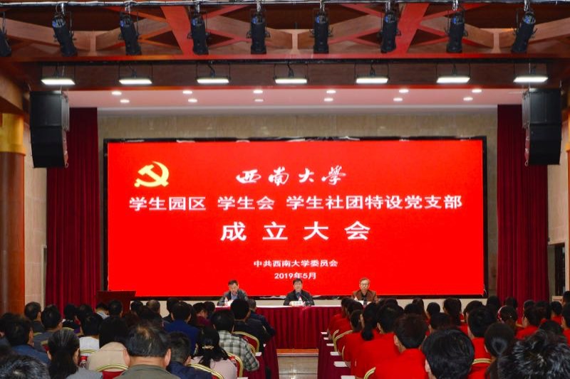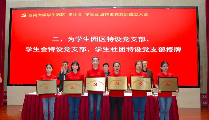 党委副书记安春元宣读《中共西南大学委员会关于成立学生园区特设党支部、学生会特设党支部、学生社团特设党支部的通知》,决定在桃园园区、李园园区、橘园园区、楠园园区、竹园园区、杏园园区等6个学生园区成立特设党支部,在校学生会成立特设党支部,在学生社团成立思想政治类、学术科技类、创新创业类、文化体育类、志愿公益类、自律互助类学生社团特设党支部。