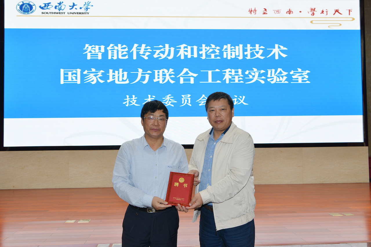 李华副书记宣读了西南大学关于聘任智能传动和控制技术国家地方联合工程实验室(重庆)第一届技术委员会的通知(西校〔2019〕261号),聘请中共第十九届中央委员会候补委员、中国科学院院士李应红担任实验室技术委员会主任,中国科学院院士、清华大学教授欧阳明高和西南大学人工智能学院教授段书凯担任副主任,同时聘请美国医学与生物工程院院士、欧洲科学院院士李长明,中国兵器工业集团研究员毛明,重庆军工产业集团总经理邓华民、西安电子科技大学王泉教授,浙江大学付新教授,香港科技大学赵天寿教授,西安交通大学陈雪峰教授,武汉理工大学华林教授,华中科技大学李锡文教授,电子科技大学胡剑浩教授,庆铃汽车集团有限公司副总经理徐松,我校薛荣生研究员、叶进教授担任技术委员会委员。张校长为技术委员会成员颁发聘书。