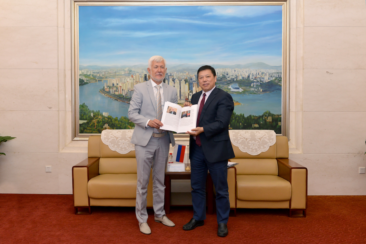 6月14日,俄罗斯雅罗斯拉夫尔国立师范大学米哈伊尔·格鲁兹杰夫校长、亚历山大·霍德列夫副校长一行来校访问,张卫国校长会见客人。