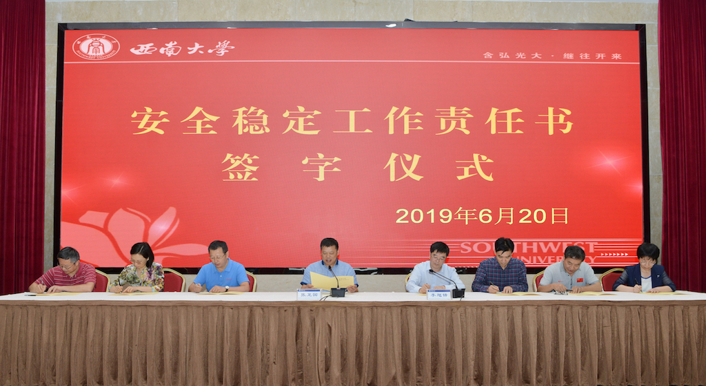 为做好学校安全稳定工作,落实二级单位主体责任,确保学校和谐、安全、稳定,6月20日下午,学校在东方红会议厅召开安全稳定工作部署会,举行安全稳定工作责任书签字仪式。党委书记李旭锋、校长张卫国与二级单位签订了安全稳定责任书。签字仪式由张卫国校长主持。