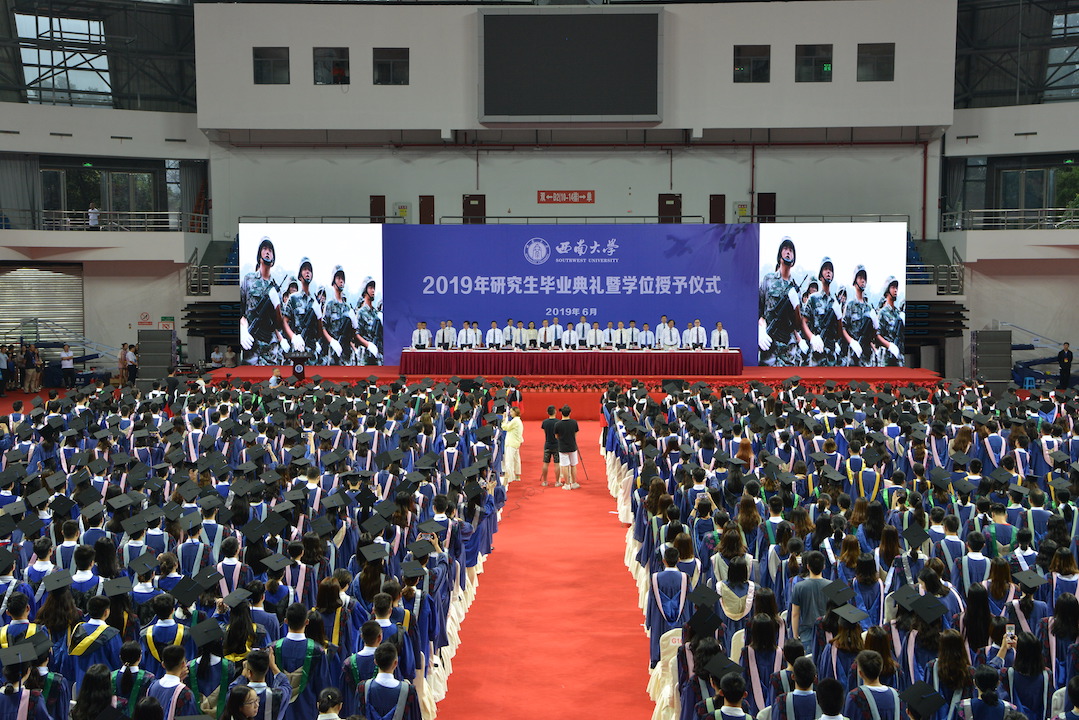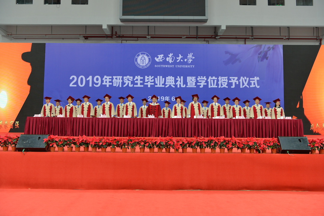 第一阶段,首先举行研究生毕业典礼。校领导、党委常委、校长助理,学校学生工作领导小组成员出席毕业典礼,典礼由学校党委副书记潘洵主持。毕业典礼在雄壮的国歌声中拉开帷幕,学校学位评定委员会副主席、党委书记李旭锋宣读了西南大学2019年研究生毕业决定和有关表彰决定;毕业生代表依次上台领取毕业证书;重庆市及西南大学优秀毕业研究生代表、基层就业优秀毕业研究生代表、优秀学位论文获得者代表分别上台接受表彰。