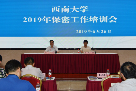 6月26日下午,学校2019年保密工作培训会议在东方红会议厅召开。重庆市国家保密局宣传法规处副处长刘进、四川大学国家保密学院讲师吕顺应邀分别作了题为《高校保密管理中应注意的问题》《高校保密行政管理》的专题讲座。学校保密委员会委员、各机关单位主要负责人、全体涉密人员等共计80余人参加会议。学校副校长、保密委员会副主任王进军主持会议。