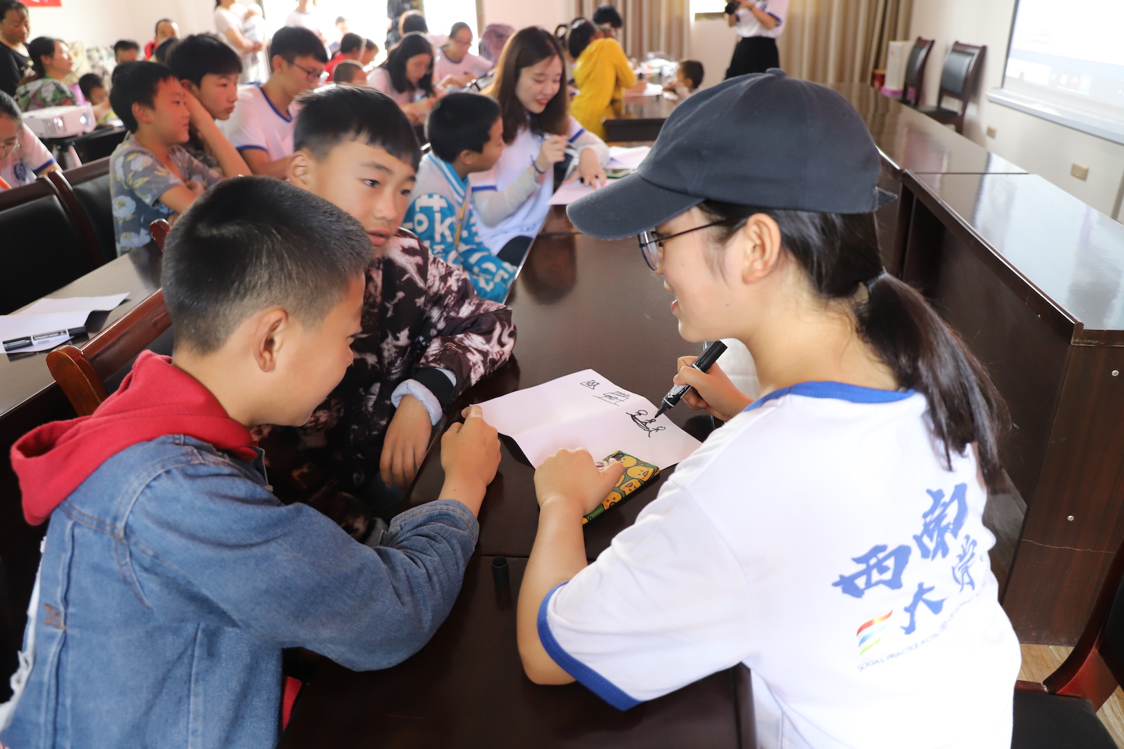 13日,瓦屋村村委会会议室内,十几名不满十岁的小朋友们手拿着气球,正全神贯注地投入到“垃圾分类”和“安全知识”的趣味讲座之中。服务团的同学们召集当地留守儿童,以讲课结合游戏的形式,帮助小朋友们树立安全意识和垃圾分类意识。讲座完毕后,小朋友们通过参加“为垃圾找家”和“你画我猜”小游戏,与大学生们进行互动交流。