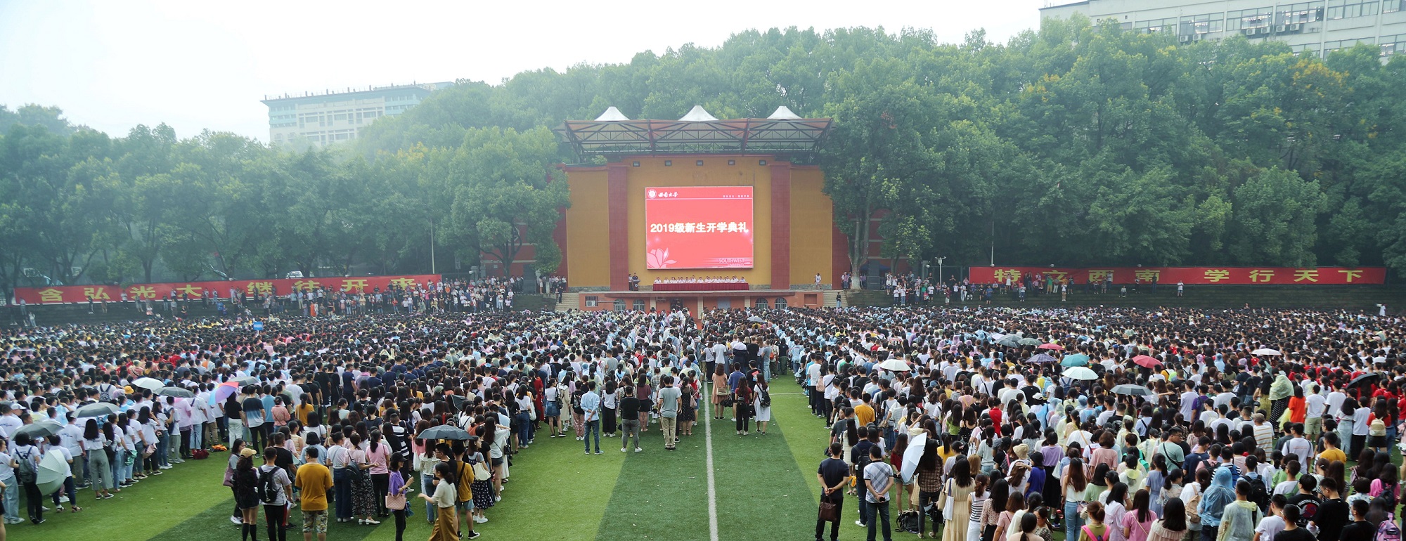 全体师生齐唱《西南大学校歌》,2019级新生开学典礼圆满结束。