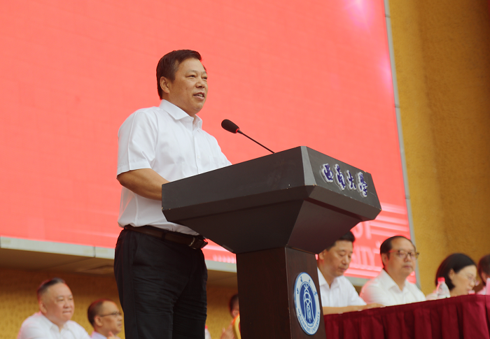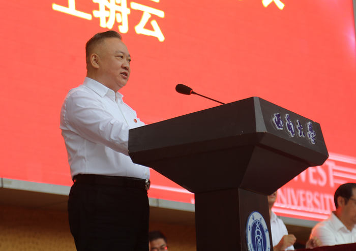 张卫国校长发表讲话,对2019级新生表示热烈欢迎,以“承西大之志,担青年之责”为题,围绕“谋民族复兴”“修君子美德”“成栋梁之才”三个奋斗坐标,深刻阐释了志与责的关系与内涵。张校长从学校的面积之大逐渐生发学生对大学和人生的思考与追寻,启迪广大学子应当追求大师之大、学术之大、能力之大、社会贡献之大,尽快融入西大,学习获得担当使命的勇气和情怀、开拓进取的境界和决心。