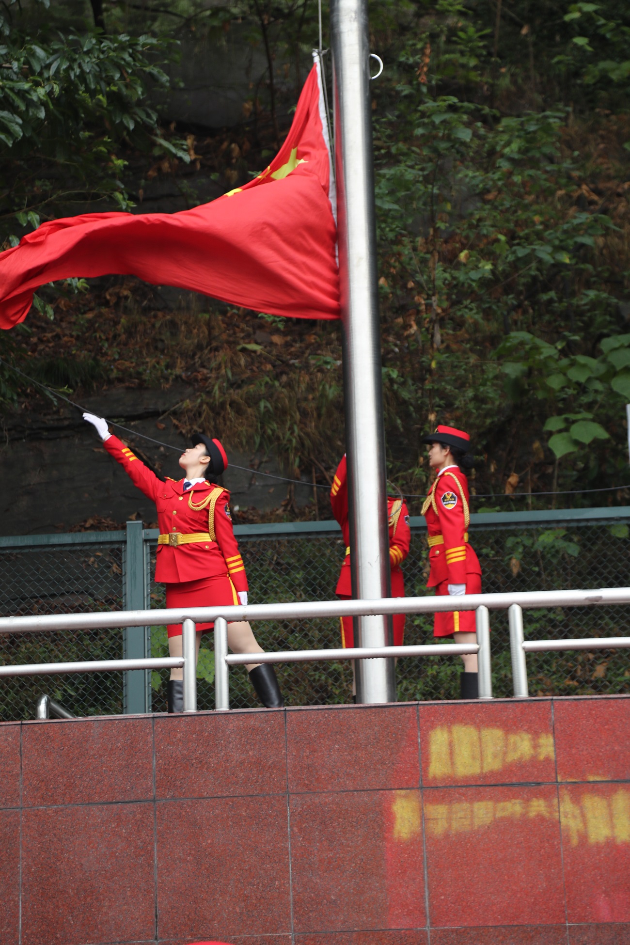 在庄严雄壮的中华人民共和国国歌声中,西南大学学生女子国旗班队员将五星红旗冉冉升起。
