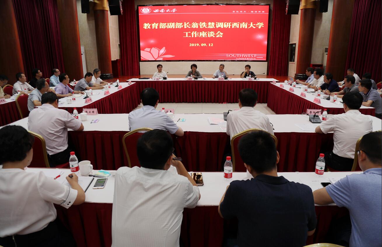 9月12日,教育部党组成员、副部长翁铁慧就加强和改进新形势下高校党建与思想政治工作及加快推进“双一流”建设等到我校考察调研。教育部学位管理与研究生教育司司长洪大用、社会科学司副司长徐艳国、教师工作司焦江方处长,重庆市副市长屈谦,重庆市委教育工委书记、市教委主任舒立春,学校党委书记李旭锋、校长张卫国等陪同调研。