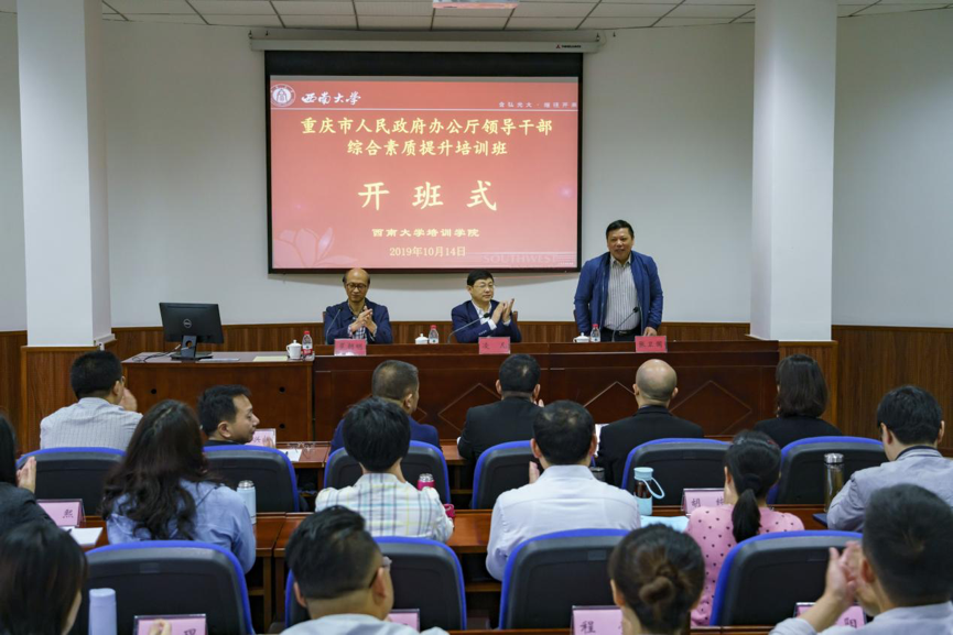 10月14日,由重庆市人民政府办公厅主办、学校承办的重庆市人民政府办公厅领导干部综合素质提升培训班在学校开班。重庆市人民政府办公厅党组成员、副主任凌凡,西南大学校长张卫国出席开班式并讲话。开班式由培训学院院长罗朝明主持。
