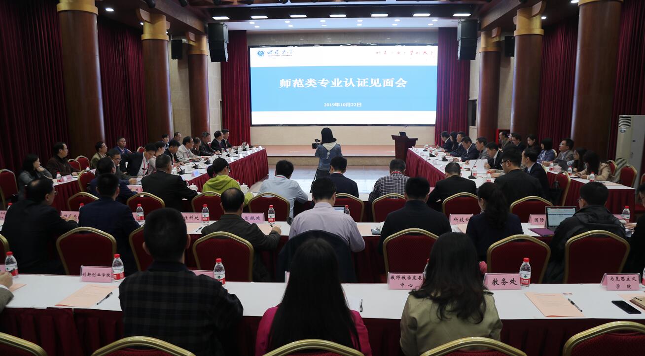 10月22日上午,师范类专业认证见面会在东方红会议厅举行。联合认证专家组全体成员,校领导、相关职能部门、直属单位主要负责人参会。会议由联合认证专家组组长庄辉明教授主持。庄辉明教授介绍了联合认证专家组13位成员,并说明本次认证的目的、任务和要求。他指出,开展师范类专业认证,是新时代全面深化教育体制改革、落实立德树人根本任务、做优做强教师教育、从源头上培养高素质专业化创新型教师队伍的重要举措。