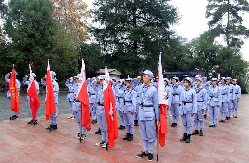 22日上午,开班仪式在娄山关文化园举行,全体参训学员身着工农红军军服参加仪式。一起观看了娄山关大捷实景表演,切身感受英勇的红军战士们高呼口号、浴血冲锋的长征精神;重走长征路、攀爬娄山关,登上娄山山脉最高峰—西风台,参观小尖山战斗遗址;伫立在毛主席题写的《忆秦娥·娄山关》碑文前,集体朗诵了这段笔走龙蛇、豪迈奔放的题词,感悟先辈们为信仰奋不顾身的精神。在结束一天的学习后,学员们传承革命先辈们吃苦耐劳精神,选用当地农家食材,自做红军饭,在大山深处点燃篝火、唱响红歌。