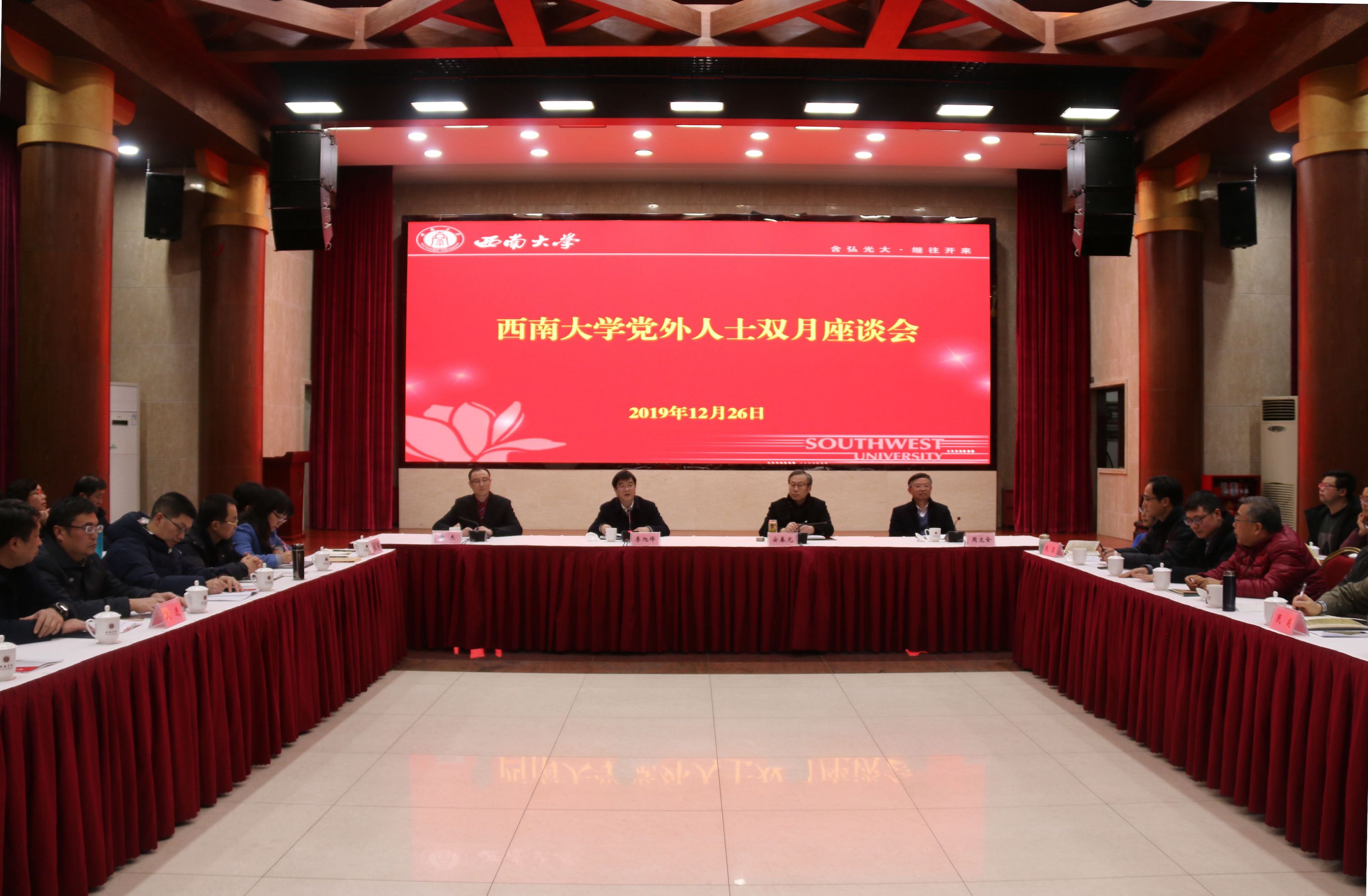 12月27日,学校召开2019年第四次党外人士双月座谈会总结全年工作。党委书记李旭锋,党委副书记、党委统战部部长安春元,党办主任黄杰出席会议,党委统战部常务副部长周文全主持会议。