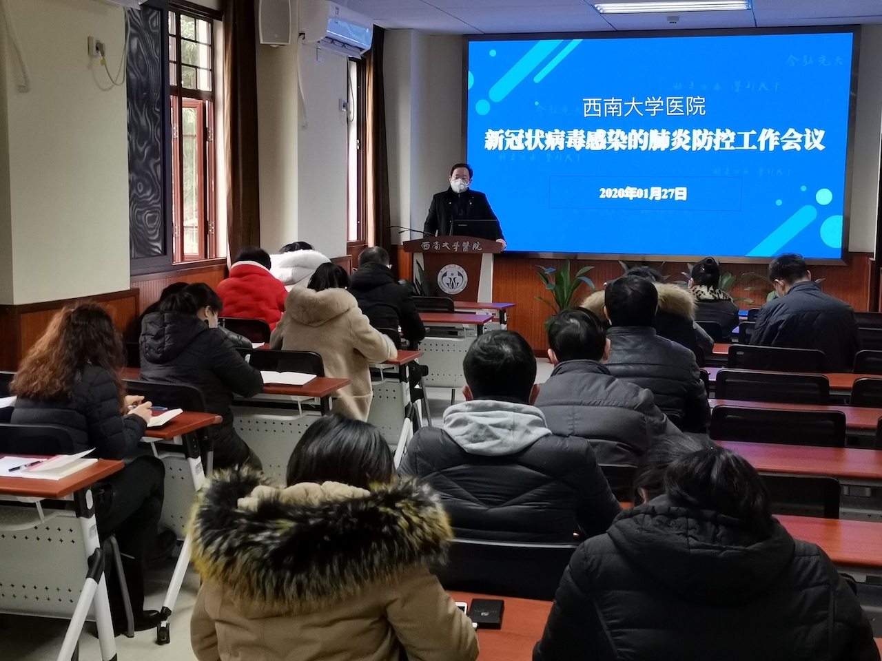 1月24日重庆市启动重大突发公共卫生事件一级响应,校医院高度重视,积极响应,落实疫情防控工作。1月27日,校医院召开第四次疫情防控工作会,完善校医院防控应急预案,全力采购医疗物资,安装疫情防控监控系统,增加安保,配合社区街道及学校做好摸排技术指导和医疗培训,协助做好消毒杀菌指导工作。同时积极开展公众答疑、辟谣等宣传工作,每日统计职工在渝情况,要求全院职工24小时待命。