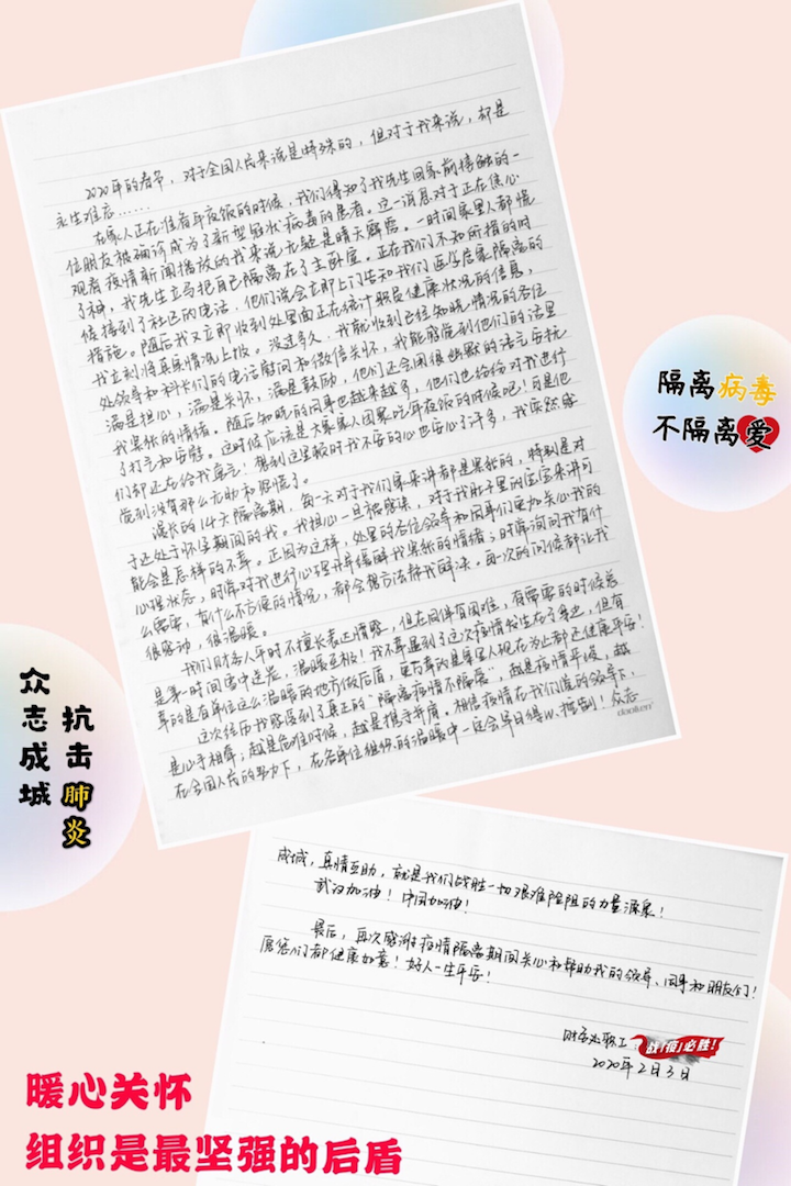 2020年2月5日,财务处收到了一位职工的来信,由于家人接触了新型冠状病毒肺炎患者,处于孕期的她经历了一段紧张恐慌的时光,正是单位和同事的温暖和关爱,坚定了她战胜恐惧的信心,目前一家人都健康平安。