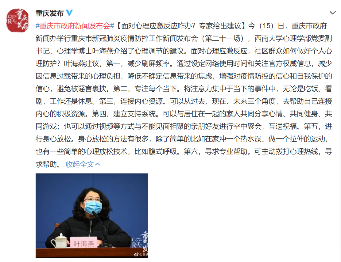 2月15日下午,重庆市召开第二十一场新冠肺炎疫情防控工作新闻发布会,市政府办公厅介绍了渝快办便民服务有关举措,市卫生健康委通报最新疫情态势,陆军军医大学医学心理系副主任杨国愉解读医护人员如何做好自我心理调适,西南大学心理学部党委副书记叶海燕解读社区群众如何做好个人心理防护。