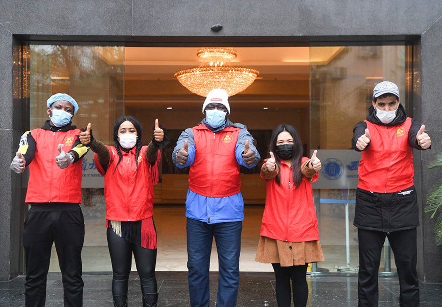 2月18日,来自西南大学的几名外国留学生比出手势,为武汉加油,为中国加油! 新华社记者王全超摄