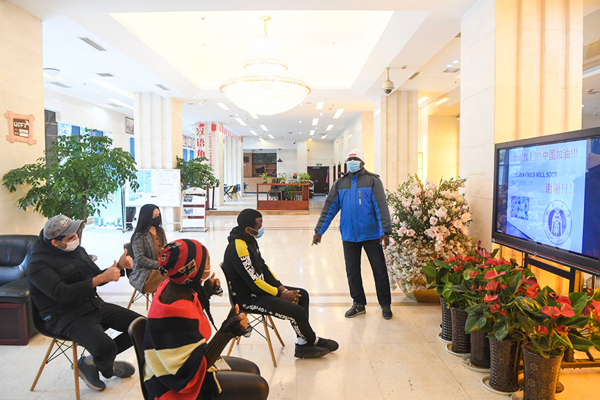 2月18日,西南大学尼日利亚籍留学生志愿者穆斯塔法(右一)与留学生志愿者分享疫情防控相关知识。