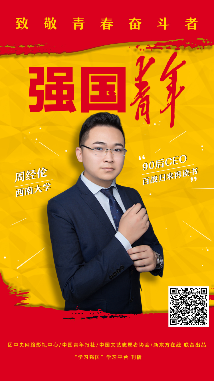 周经伦同学作为“强国青年观察员”,在公开课上讲述了入选“中国新锐社群领袖30强”背后的创业经历,分享了发起“声律启蒙”志愿服务计划、带领32所高校1200余名高校志愿者为3200余名儿童点亮人生希望,在抗疫期间为疫情防控一线募集物资的志愿服务故事,展现了西南大学青年弘扬新风、向上向善的精神风貌,激励更多新时代中国青年学子把自己人生价值的实现与国家和民族的前途、命运紧紧相连,勇做走在时代前列的奋进者、开拓者、奉献者。
