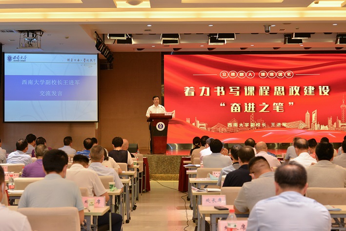 王进军代表学校作题为“立德树人 抓准抓实 着力书写课程思政建设‘奋进之笔’”的发言,从建章立制抓重点、做好课程思政顶层设计,点面结合抓覆盖、构建课程思政良好生态,立足课程抓贯通、打通课程思政建设全链条,注重统筹抓协同、营造课程思政建设氛围等方面,对学校课程思政建设做了全面介绍。
