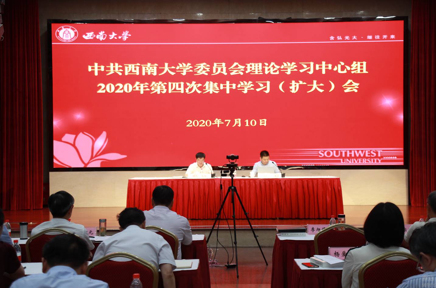 为深入学习习近平总书记关于推动成渝地区双城经济圈建设的重要讲话精神,进一步融入国家战略、服务地方发展,7月10日上午,学校召开2020年度第四次党委理论学习中心组学习(扩大)会。党委书记李旭锋主持会议,校领导、党委委员、纪委委员以及二级党组织党委理论学习中心组成员分别在东方红会议厅主会场和各二级党组织分会场参加视频会议。