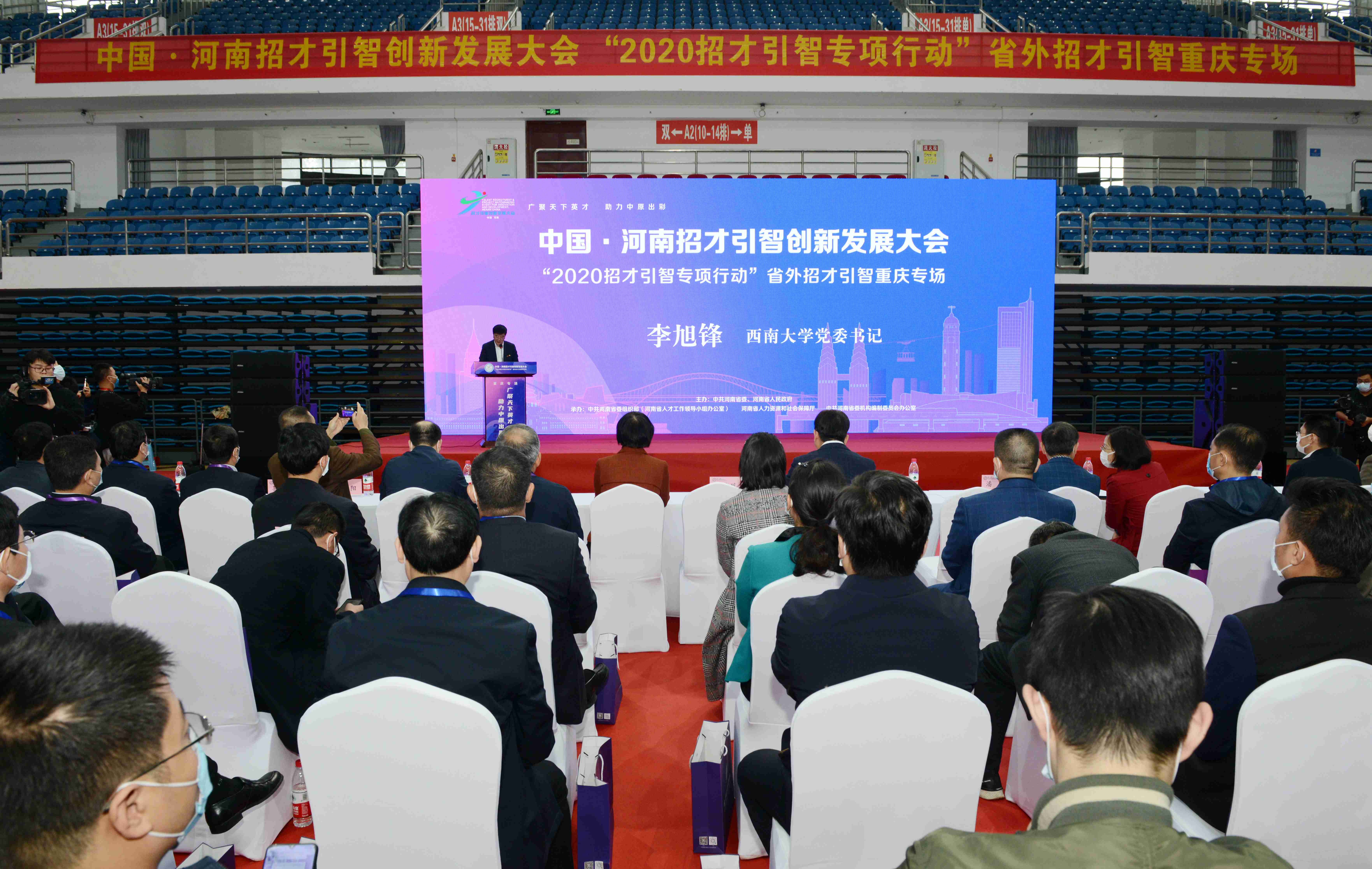 10月17日,中国·河南招才引智创新发展大会“2020招才引智专项行动”省外招才引智重庆专场招聘活动在学校中心体育馆成功举办。学校党委书记李旭锋出席开幕式并致辞,河南省人力资源和社会保障厅厅长刘世伟宣布开幕。