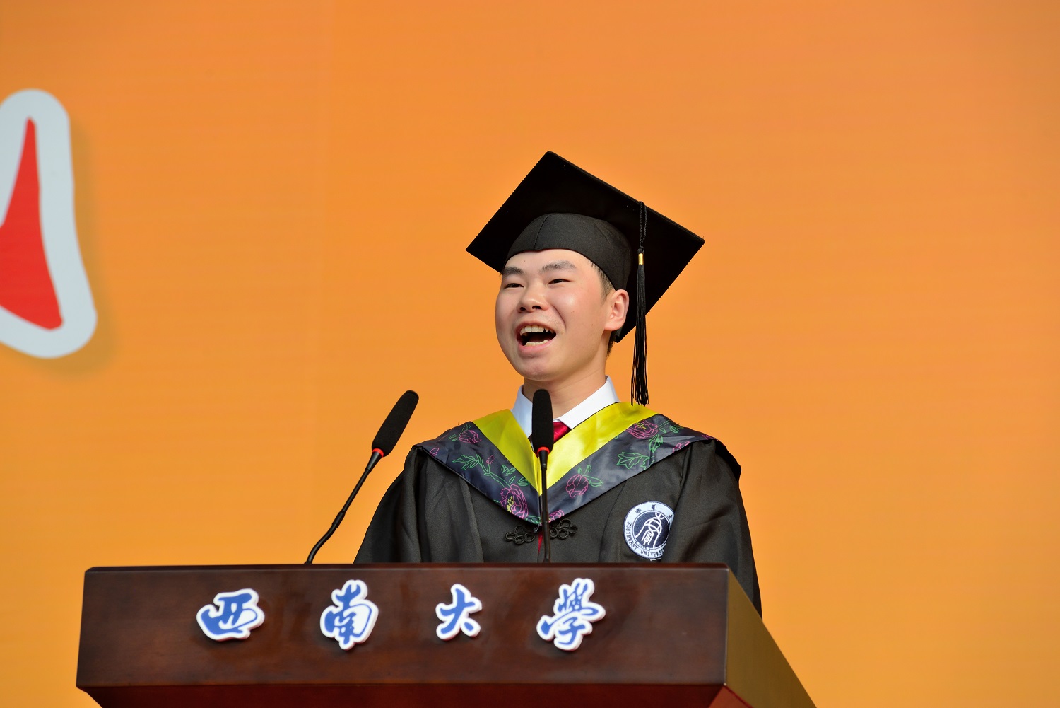 毕业生代表创新创业学院(含弘学院)胡云桐同学分享自己道阻且长、行而不辍的学习科研经历,号召同学们怀揣热爱、踔厉奋发,在时代浪潮中贡献青春力量,共续西大荣光。