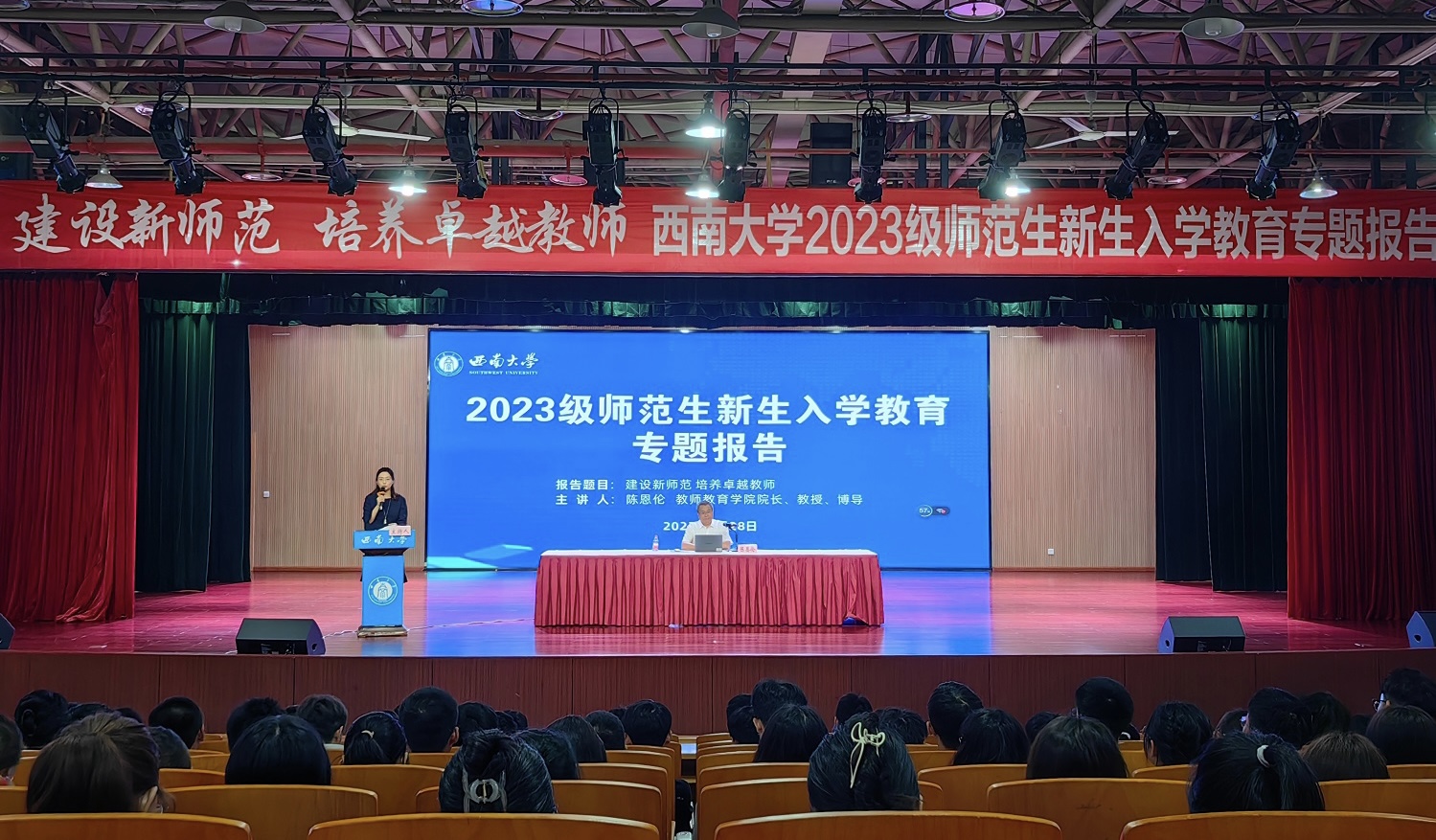报告主题为“建设新师范,培养卓越教师”,由教师教育学院院长陈恩伦主讲。陈恩伦围绕我国师范教育的历史发展、师范教育改革的必要性、新师范新在哪里以及西南大学新师范改革探索等四个方面进行了系统阐述。陈恩伦指出,面对新师范的新定位、新要求、新机制和新体系,西南大学在继承了师范大学传统的基础上,在综合性大学框架下开展教师教育工作,是学校教师教育工作体制机制的优势和特色。在新师范改革探索中,学校将贯彻落实党和国家部署,为健全中国特色教师教育体系不断发挥作用。