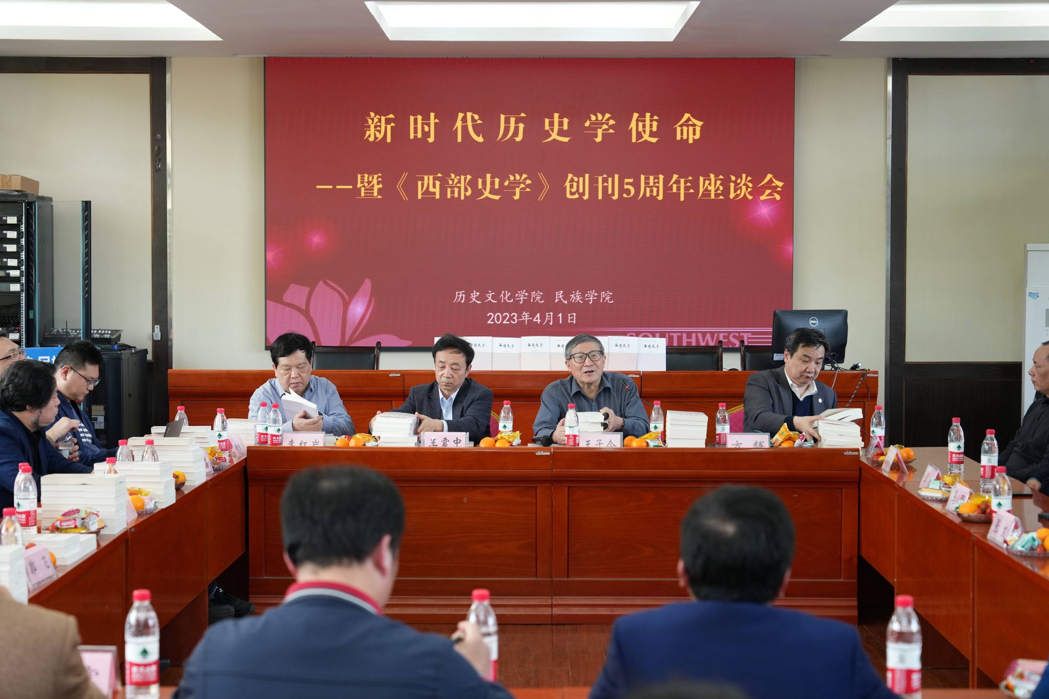 4月1日,历史文化学院 民族学院在学院报告厅成功举办“新时代历史学使命暨《西部史学》创刊5周年座谈会”。来自中国社会科学院大学、中国社会科学杂志社、中国人民大学、山东大学、烟台大学、重庆师范大学及西南大学期刊社、历史文化学院 民族学院的专家学者共计60余名师生出席本次座谈会。座谈会由历史文化学院 民族学院院长邹芙都主持。