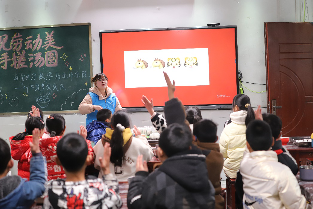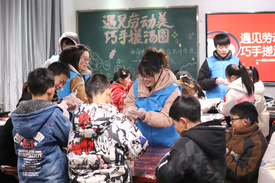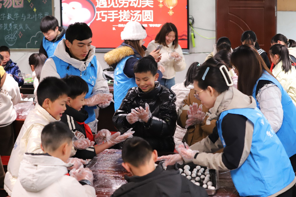 据悉,本次活动是西南大学数学与统计学院研究生寒假社会实践活动之一。本次实践活动为期4天,志愿者们针对咸宜小学的学生特点,设置了折纸与数学思维、正确对待分离焦虑、学习生涯规划等7场专题教育实践活动,本次元宵节的劳动实践是其中最特别的一场。“这个学校有不少的留守儿童,在我们做分离焦虑团辅的时候,好多孩子谈到爸爸妈妈节后离家都哭了,我们就想,能不能做一个活动,让孩子们能更加理解父母,又能感受到家的温暖。”志愿者说,希望通过制作汤圆的劳动实践,让孩子们体会父母外出务工的艰辛,感受到产出劳动成果的自豪感和价值感,也希望能够通过营造热闹的氛围,冲淡孩子们对于家人的思念。
