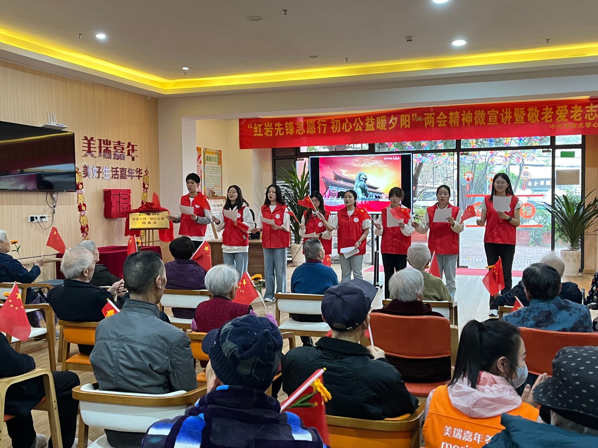 服务点的成立不仅为老年人提供了一个心理关爱的平台,也为党员志愿者提供了一个实践和锻炼的机会。当日,西南大学心理学部20余名志愿者在服务点开展了“红岩先锋志愿行 初心公益暖夕阳”两会精神微宣讲暨敬老爱老志愿服务活动。心理学部学生党建组织“心+”红色空间站站长丁汝向老年人进行了两会精神微宣讲,讲解了2024年全国两会中关于养老的议题政策,心理学部睡眠神经影像中心学生金巧进行了“宁心助眠”心理健康知识小讲堂,帮助老年人和养老服务工作者了解关于睡眠的心理学知识,并现场教授了深呼吸放松训练、正念冥想助眠等改善睡眠质量的实用技巧。“心+”红色空间站成员和各党支部志愿者与老年人进行“心灵驿站”交流,用明信片为老人们送上和煦温暖的“春日来信”,向老人分享自己所感受的美好春天,互动中或为老人捏捏肩、捶捶背,或仔细聆听老人诉说往事、说烦忧,让老人感受到春天般的温暖和舒适。活动中还穿插了志愿者们精心准备的古筝演奏、歌曲合唱等文艺表演。随着活动的进行,老人的孤独感渐渐得到排解,绽放出幸福的笑容。