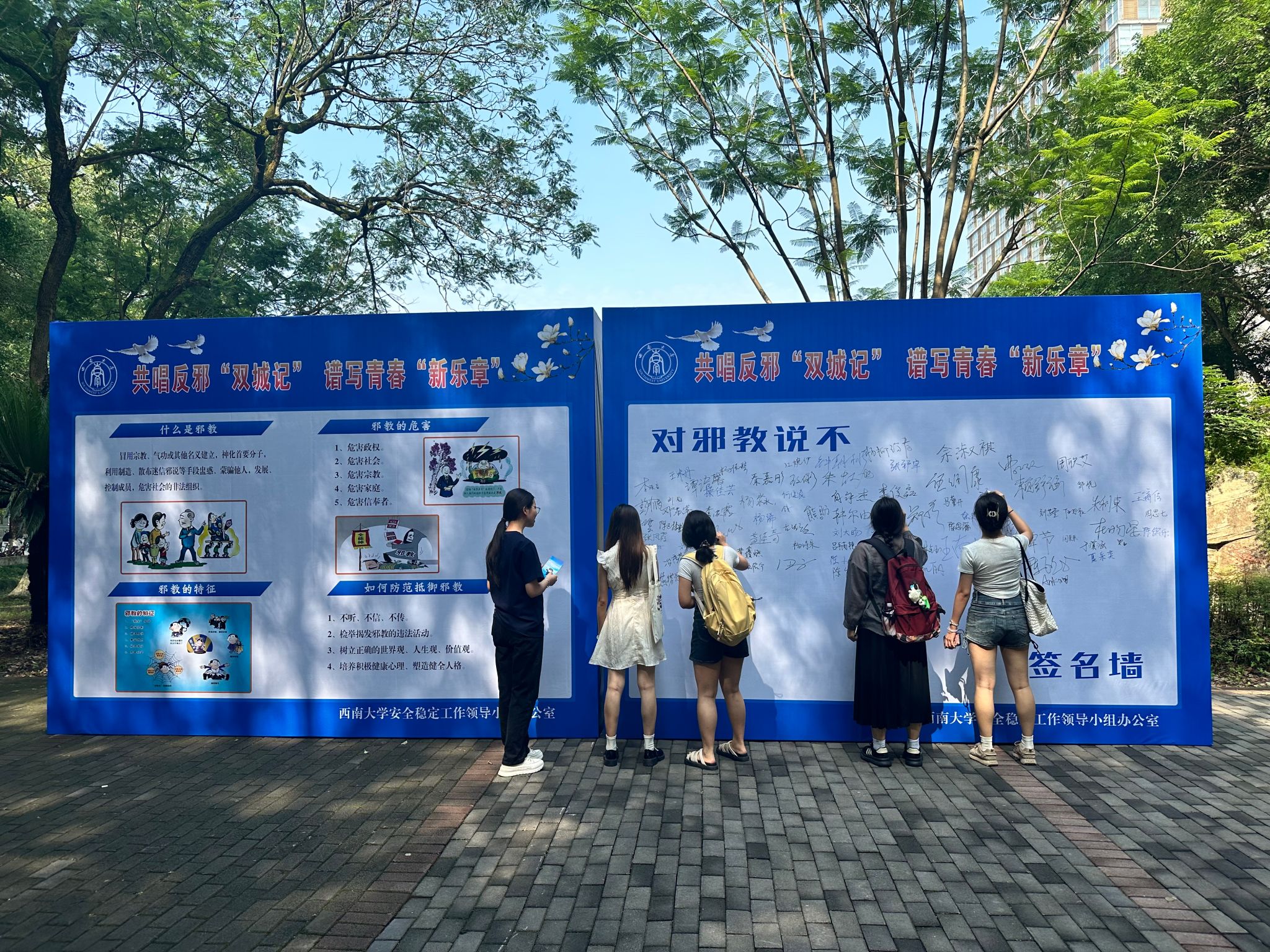 6月12日上午,学校保卫处组织开展了“对邪教说不”线下签名活动。现场工作人员向参与活动的师生详细讲解了反邪教相关知识,同学们在反邪教签名墙上,以签名为承诺,以反对邪教为己任,自觉远离邪教,坚决做到不听、不信、不传、不参与。活动现场气氛浓厚,吸引了近千名师生积极参与,纷纷表示要做校园反邪卫士。