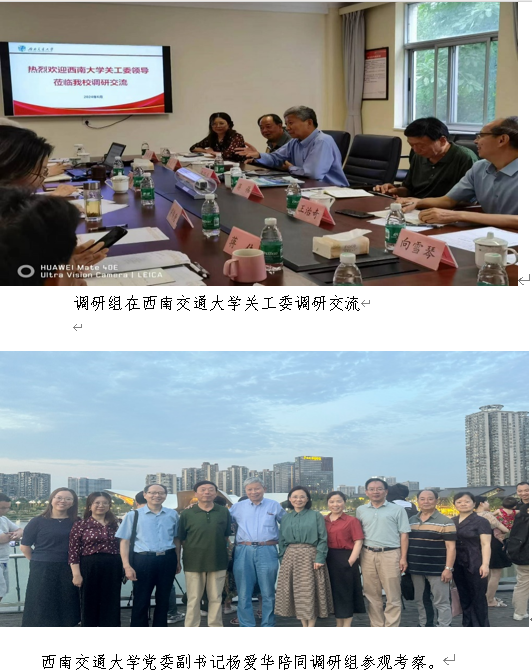 为进一步落实中办、国办《关于加强新时代关心下一代工作委员会工作的意见》和中共教育部党组《关于加强新时代全国教育系统关心下一代工作委员会工作的意见》,提升我校关工委工作的质量效果,6月11日至13日,校关工委常务副主任宋乃庆带领校关工委秘书处成员赴四川大学、电子科技大学、西南交通大学等高校调研交流。